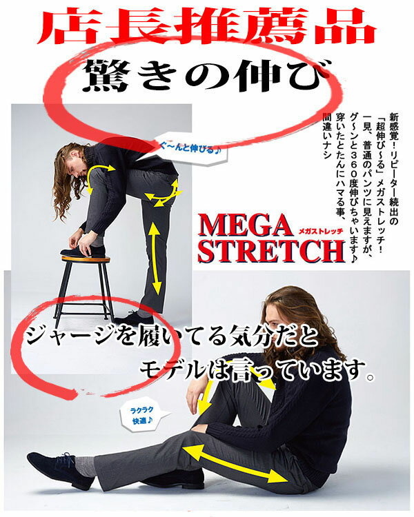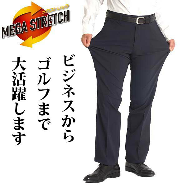 メガストレッチ/ストレッチ/スラックス/ウォッシャブル/スリム/ノータック/超ストレッチ/ゴルフ/ビジネス/涼しいパンツ/ ビジネス はもちろん カジュアル としても活躍の ビジカジ スラックス ゴルフ 専門の販売店でも取り扱われる ゴルフウェア メンズ パンツ としてもご使用いただける メガストレッチ ノータック スラックス 履いたら肌が冷んやりする 接触冷感 生地。